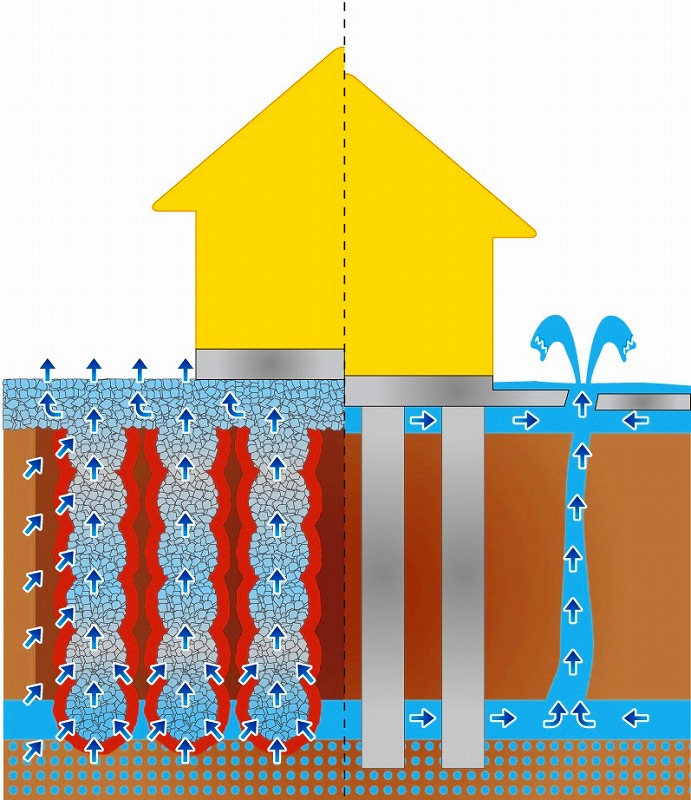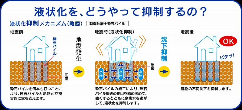 地震の時、家の揺れ方と地盤の揺れ方に違いがあり、杭はその変化に耐えられないこともあるが、砕石バイルはもともと固まっていないため、地盤の揺れに追随して、地震の揺れによる強度低下をやわらげる効果があります。